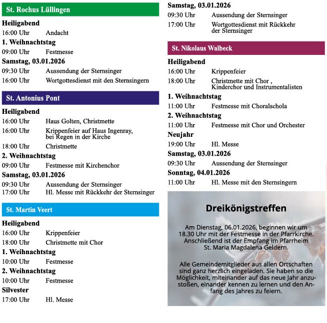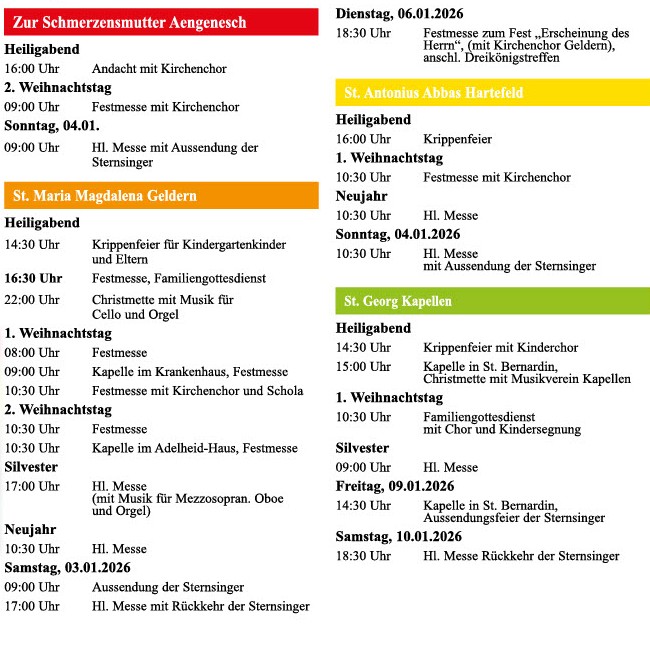 In Geldern werden in der St. Maria Magdalena-Kirche über 1.000 Kerzen zu einem großen Stern angeordnet. Die Veranstaltung beginnt um 16:30 Uhr mit der offiziellen Kerzenentzündung, um 17:00 Uhr folgt ein Familiengottesdienst. Anschließend sind alle herzlich zu einer Begegnung im Pfarrheim eingeladen. Dort warten Glühwein, Kinderpunsch, Würstchen und belegte Käsebrötchen auf die Gäste – Gelegenheit für Gespräche und Gemeinschaft in besonderer Atmosphäre. Zudem gibt es interessante Einblicke aus erster Hand in die Arbeit von Caritas in Mexiko.