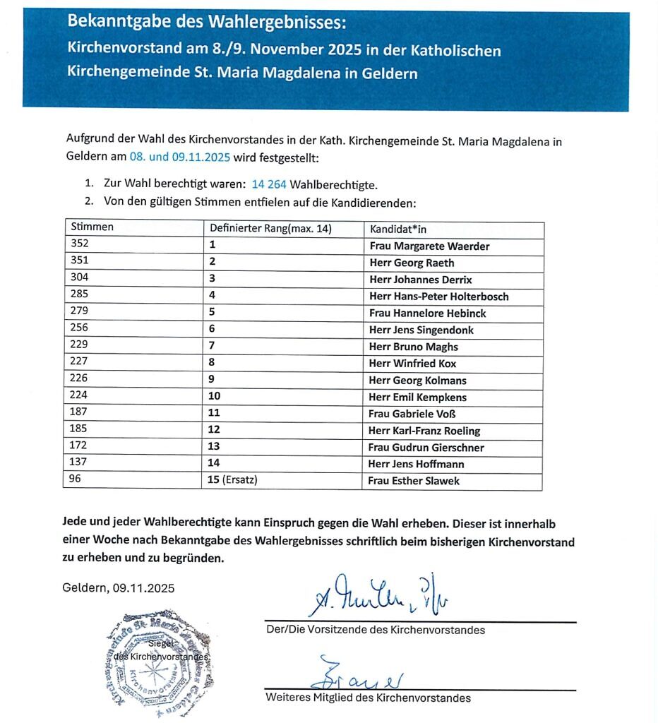 Hiermit veröffentlichen wir die offiziellen Ergebnisse dieser Wahl und bedanken uns erneut bei allen Pfarreimitgliedern, die entweder vor Ort in unseren Wahlbüros oder auch bereits vorab per Briefwahl an dieser Wahl teilgenommen haben.