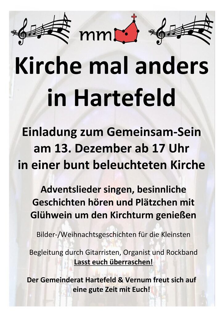 13. Dezember ab 17.00 Uhr zum Format „Kirche mal anders“ nach Hartefeld ein. Der bunt ausgeleuchtete Kirchenraum sorgt für ein tolles Ambiente und verleiht dem sonst nüchtern-würdevollen Ort eine ganz besondere Wirkung.